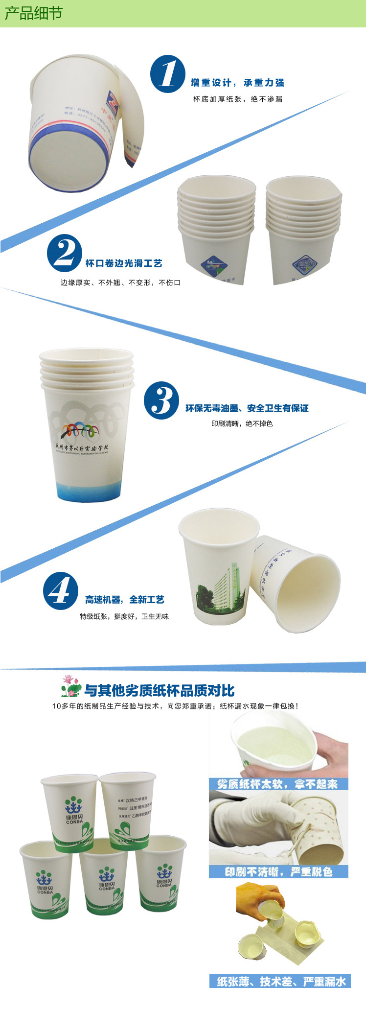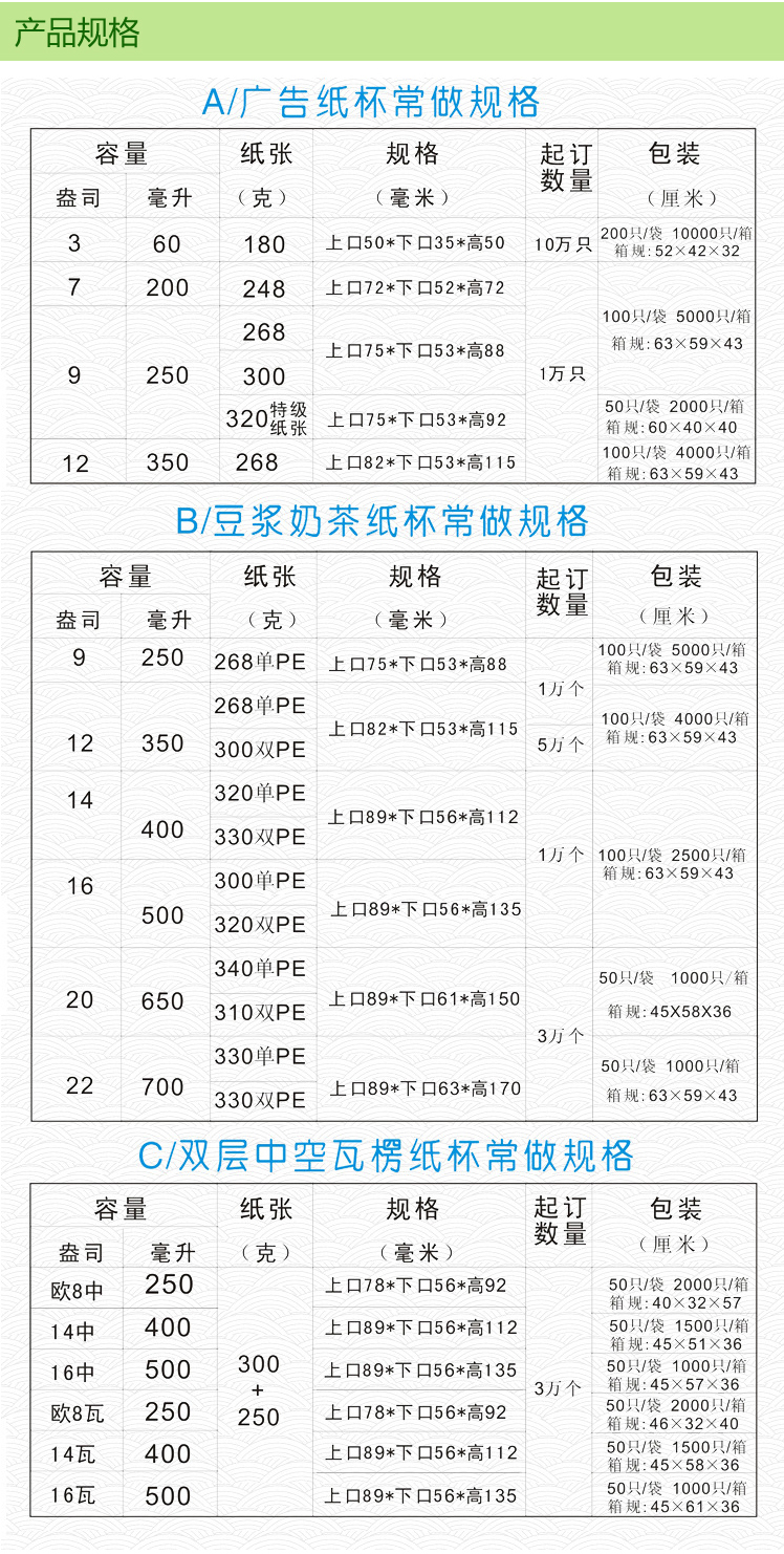 選擇我們的優(yōu)勢(shì):耐高溫、不滲漏、不做熒光漂白處理、無(wú)異味、紙杯增厚、可免杯托、柔版印刷,環(huán)保油墨