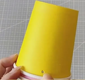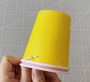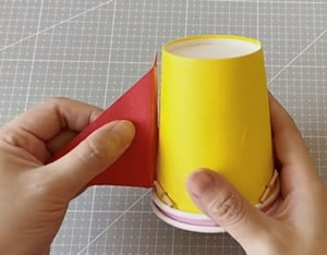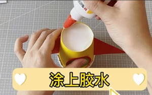 都裝飾好了之后在一次性紙杯的頂上一圈涂上膠水,再把之前做好的圓錐固定在一次性紙杯的頂上。